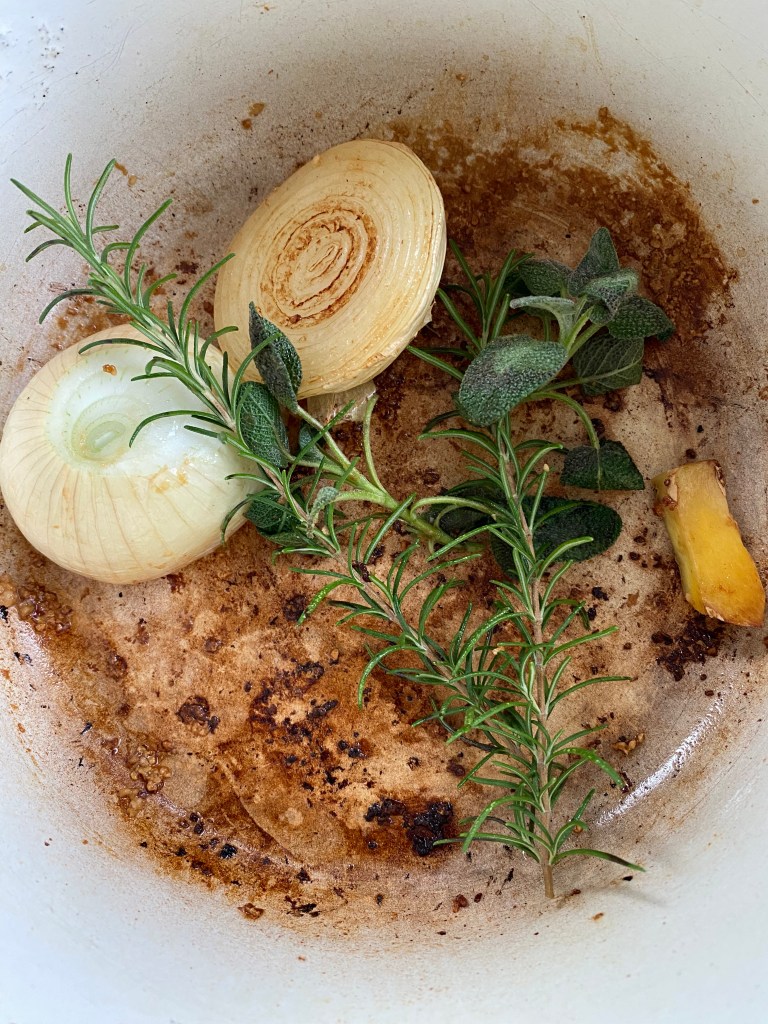 Heat oil in a large pot over medium-high heat. Add onion, garlic, and ginger (place cut side down). Cook until fragrant. Add celery, herbs and turmeric. Cook and stir about 4 minutes. Add chicken carcass and 12 cups of water, bring to a simmer and reduce heat to medium-low. I cook anywhere from 2 to 6 hours (Whatever you have time for. The longer it cooks, the more flavorful). Once cooked, strain everything out. Use immediately or freeze. (adapted from Alison Roman’s, “Dining In” cookbook–check her out here!)